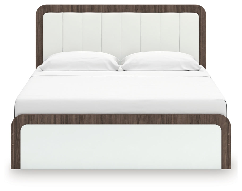 Looking to make a subtly striking statement in your bedroom? We've got you covered. This king upholstered bed’s sophisticated two-tone treatment marries a warm brown finish over replicated walnut grain with a white finish. Highlighted with a wonderful white faux leather, the headboard features warm ambient lighting for that cozy feeling we all love at bedtime. Rounded corners radiate an air of modern panache. It’s a master class in contemporary yet comfortable character.