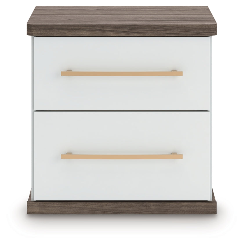 - Two-tone with a dark brown finish over a replicated walnut grain and a matte white finish.