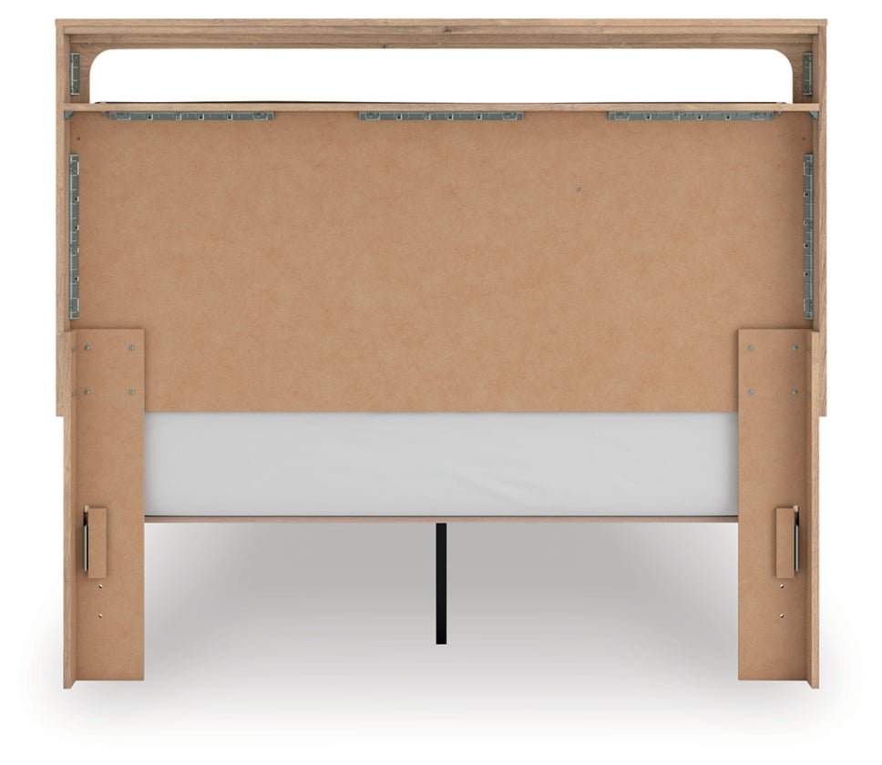 The natural wood tones and clean lines of this queen upholstered platform bed echo your easygoing style sensibilities. With a warm finish and replicated oak grain, its carefree character lightens up your bedroom. Curved inner corner details soften the look, while contrasting brown fabric modernizes the feel. And for added function, warm LED lighting adds serene ambiance at the touch of a button.