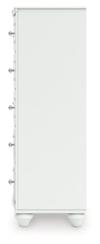 Fit for a princess. This chest of drawers’ crisp matte white finish pairs with charming elements like bun feet, crystal knobs and ornate beading—the perfect crowning touches for your girly girl. This spacious five-drawer piece is sure to make your little one feel like royalty.