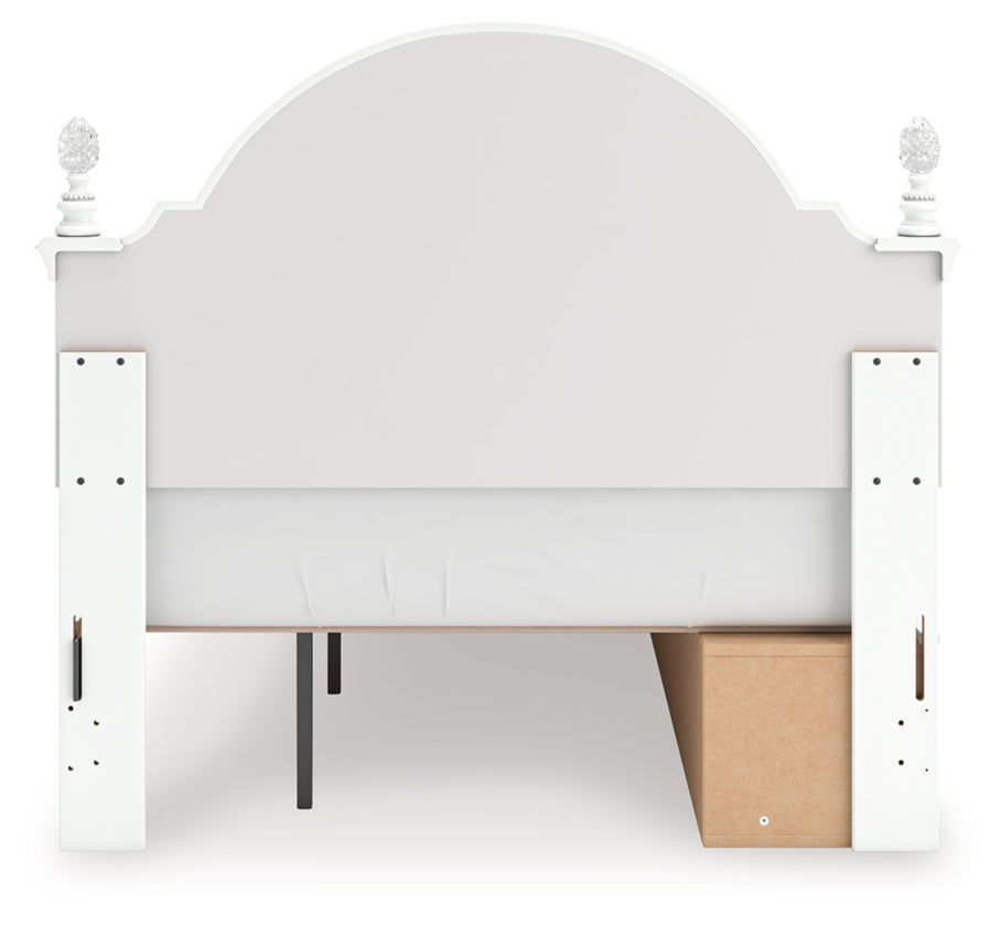 Fit for a princess. This full upholstered panel storage bed’s crisp matte white finish pairs with charming ornate beading details and sumptuous button-tufted upholstery—perfect for your girly girl. Spacious storage drawers neatly tuck away bedroom essentials, while decorative ball tops and multicolored LED lighting in the headboard are the crowning touches to make your little one feel like royalty.