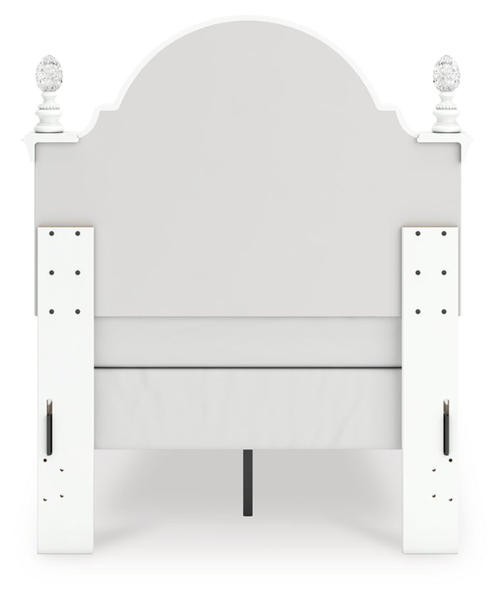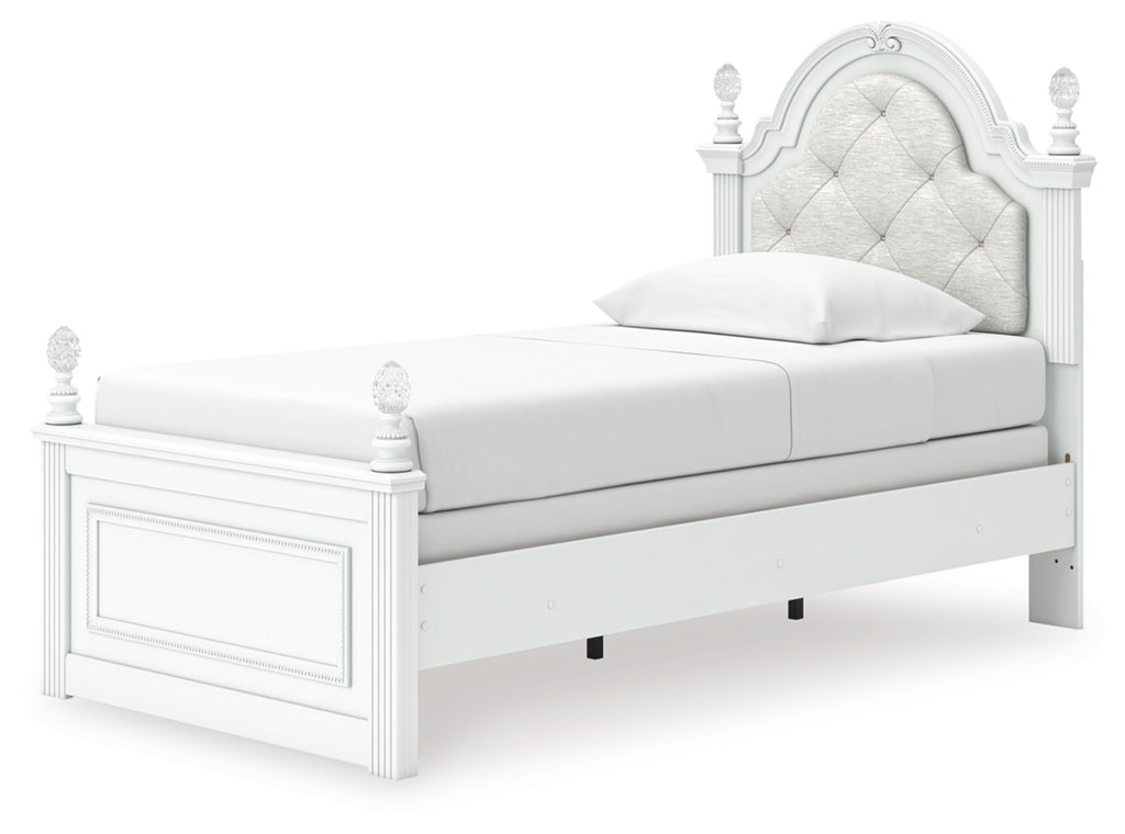 Fit for a princess. This twin upholstered panel bed’s crisp matte white finish pairs with charming ornate beading and sumptuous button-tufted upholstery—perfect for your girly girl. Decorative ball tops and multicolored LED lighting in the headboard are the crowning touches to make your little one feel like royalty.