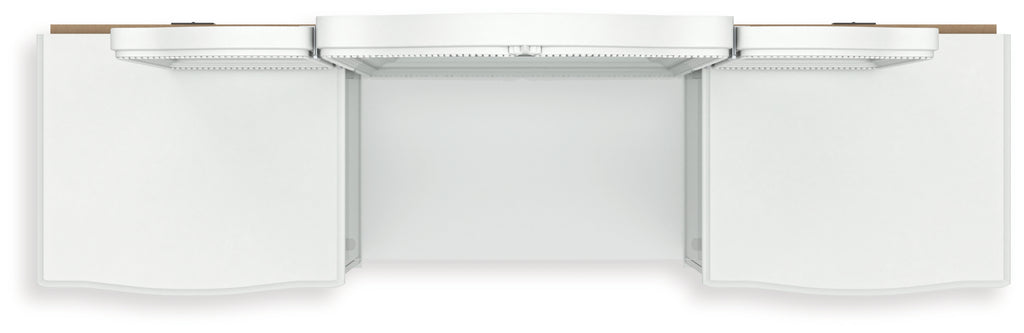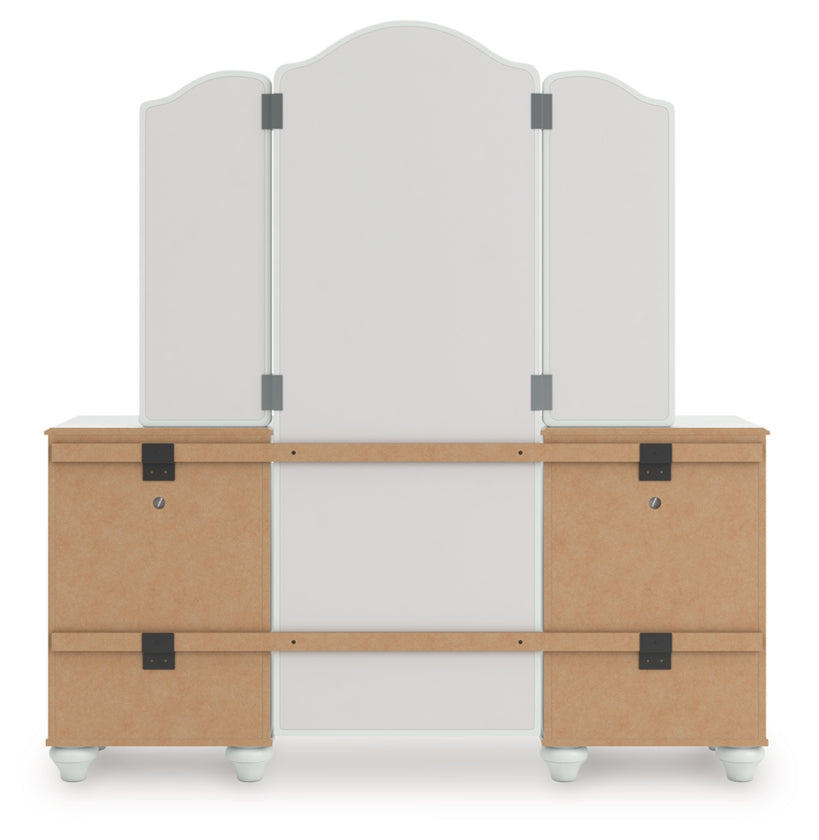 Fit for a princess. This vanity with mirror’s crisp matte white finish pairs with charming ornate beading details—perfect for your girly girl. The mirror's ambient lighting adds a touch of romance, while the bun feet and crystal knobs on the cabinet are the crowning touches to make your little one feel like royalty.