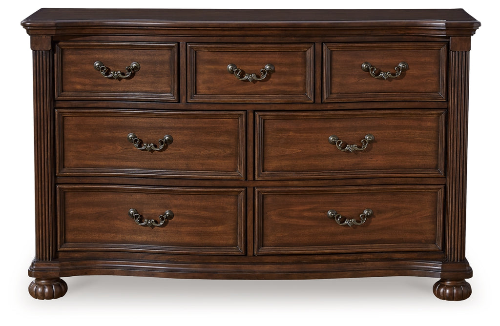 Take inspiration from the traditional luxury of this dresser. Classic with a rich cherry brown finish, its stately presence graces your room with an air of opulence. Your taste for exquisite details is satisfied with decorative drawer pulls and chic bun feet. With seven drawers acting as elegant hosts for clothes and other essentials, your restful retreat has never been so refined.
