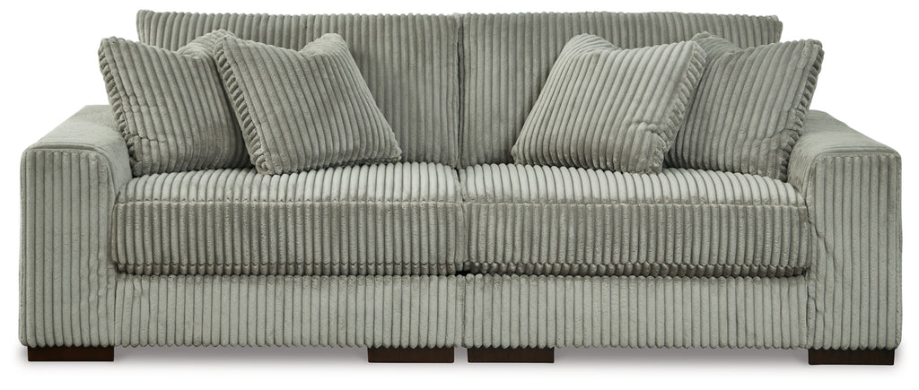 Plush and posh. Showcase your eye for on-trend texture with the statement-making cord upholstery of this sectional loveseat. Its stunningly soft fabric entices in a warm neutral hue, complementing contemporary color palettes. Sink into the cushions and plan to stay a while—this cozy living room centerpiece highlights your high-end approach to comfort and style. Oversized swivel accent chair included.
