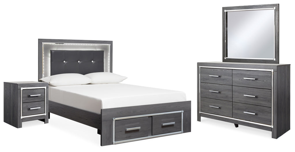 Lodanna Queen Upholstered Panel Storage Bed, Dresser, Mirror, and Nightstand