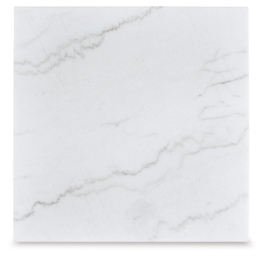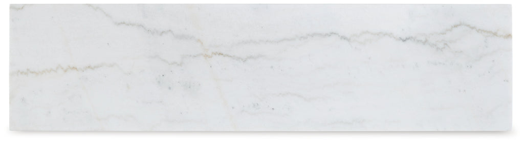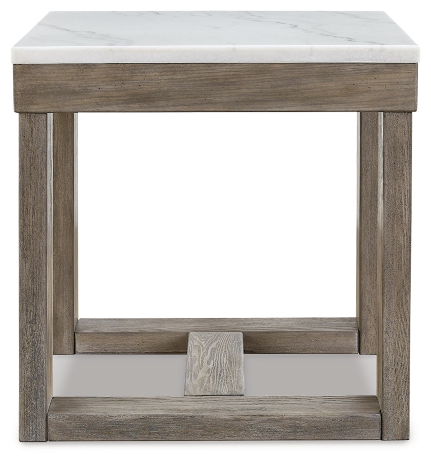 This coffee table is simple in design but big on style. Finished with a trend-right grayish brown wood tone, its bold, blocky profile and natural marble top are timeless classic choices that work so well with large sectional family room settings. Adding to its beauty, the marble top's color variations, fissures, mineral deposits and veining are naturally formed and are not defects. Matching end table and sofa table included.