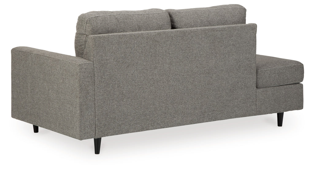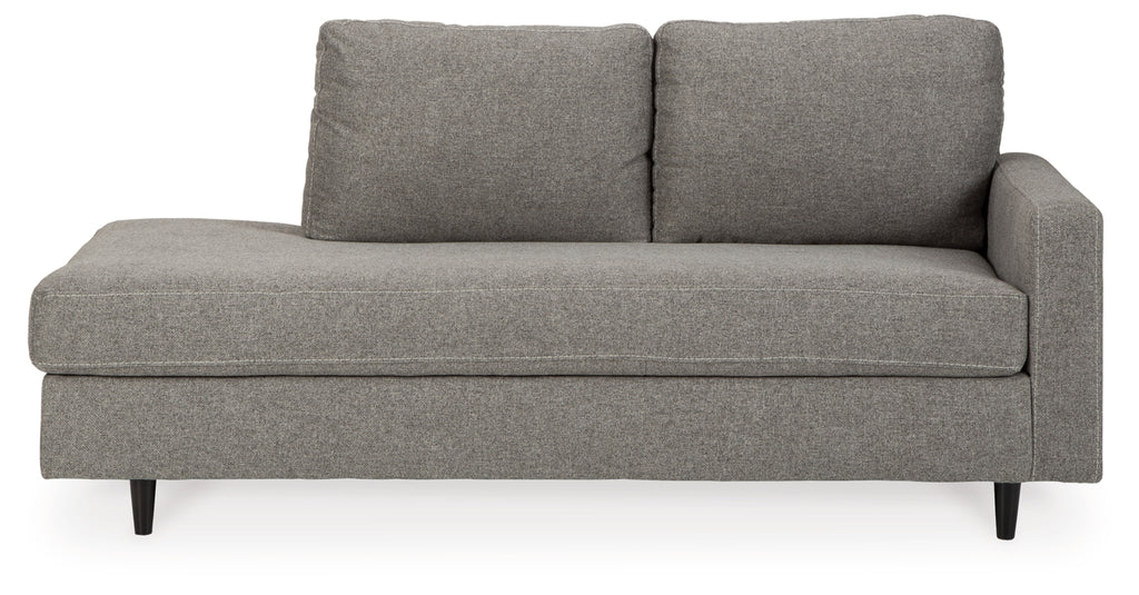 Mixing mid-century inspiration with modern attitude, this right-arm facing chaise is as retro chic as it is fashion forward. Loaded with multi-tonal interest, the granite gray upholstery is the essence of earthy elegance. Design elements include slim track arms and tapered accent legs that are right on point.