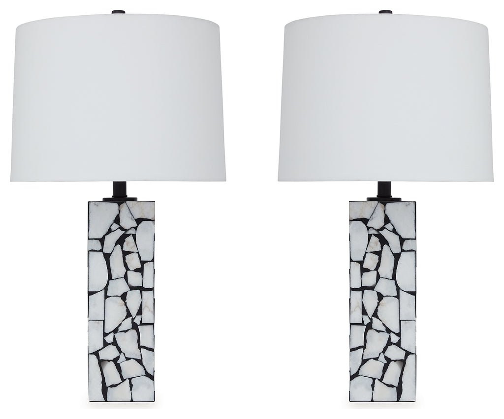 This exquisite table lamp is artfully adorned, with a mosaic pattern of white marble playing beautifully against a black background. Complemented by a modified drum shade for a sophisticated sensibility, the lamp casts an elegant glow in the entryway or living area.