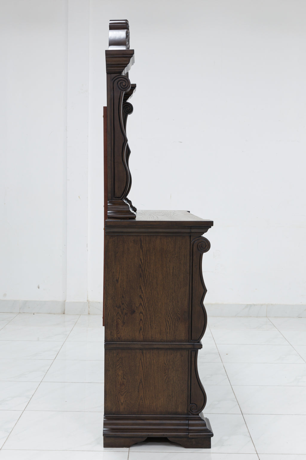 - A choice blend of materials is accented by detailed ornamental appliques and large-scale decorative scrolled pilasters make a grand stance.