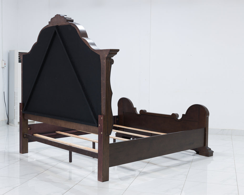 From its ornamental appliques to its large scale, this king upholstered bed makes a bold statement. Showcasing sculptural ornate details and button tufting, this opulent bed wows with stunning style. The look is timeless. The feel? Right at home. Matching dresser, mirror, chest and 2 nightstands included.