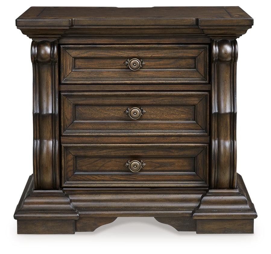 - Three drawer night stand features a concealed drawer for keeping valuables out of sight and includes a 110V power supply with dual USB charging ports.