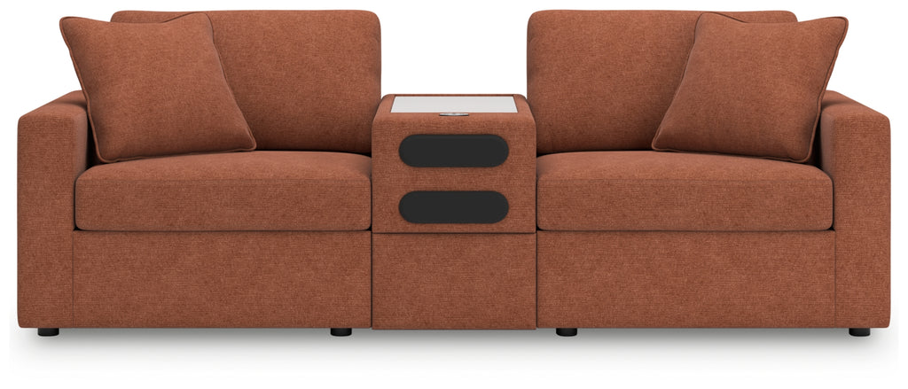 - Includes 3 modular pieces: left-arm facing corner chair, audio console with storage and right-arm facing corner chair