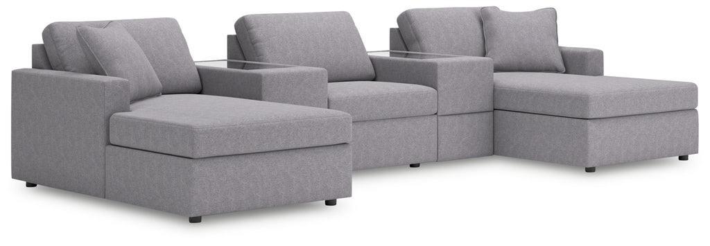 - Includes 5 modular pieces: left-arm facing corner chaise, 2 consoles with storage, armless chair and right-arm facing corner chaise