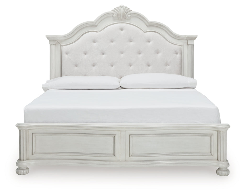 Transform your inner sanctum into a haven of timeless elegance. This traditionally inspired California king upholstered panel bed features a cushioned headboard embellished with a serpentine-shaped crown and light pearl gray upholstery. A contoured footboard with picture frame moulding completes the ageless aesthetic. And did we mention the classic antiqued white finish and stylish reeded bun feet? Talk about relaxed refinement.