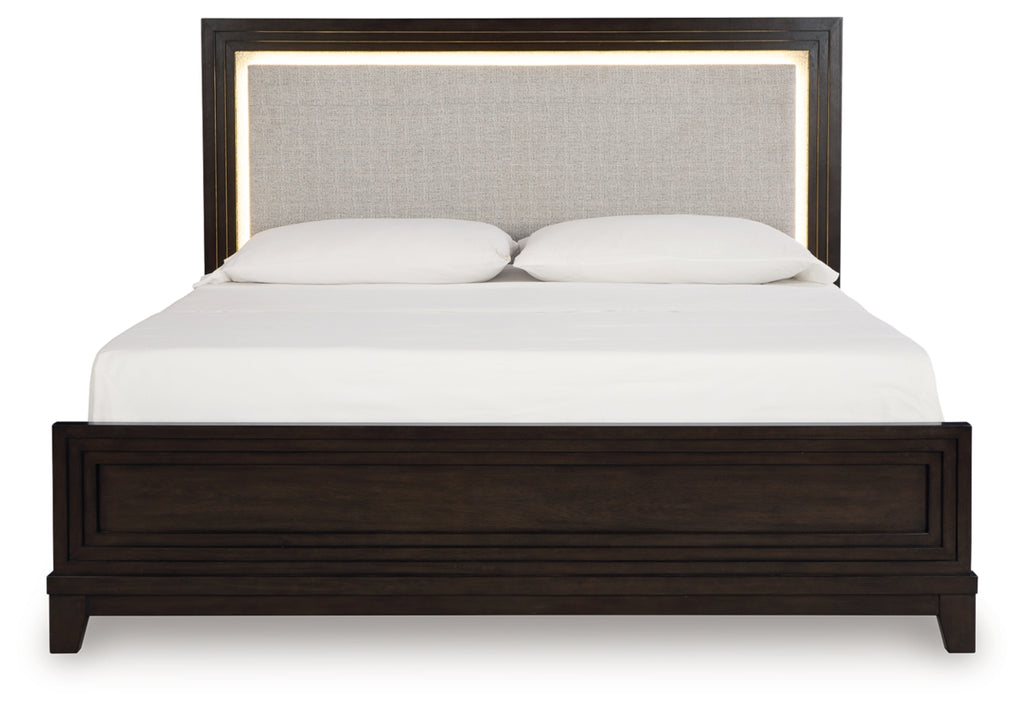 - Headboard features a floating inset upholstered panel with a light gray Next-Gen Nuvella™ performance fabric for worry free cleanability and an LED back-light.