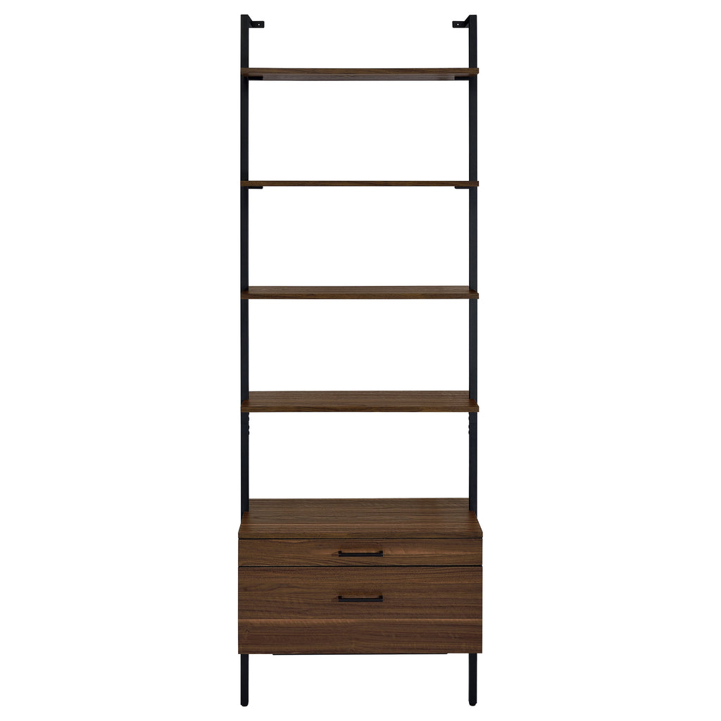 Play up the light, airy ambiance of a modern space while making use of every inch with a modern wall bookcase. It features four floating upper shelves and a lower case with two drawers, perfect for a blend of storage and display in any room. The shelves and two drawers feature a warm walnut finish over melamine paper, offering durability for a lovely look that lasts. A black finish metal frame supports the bookcase, offering neutral appeal in any setting. Stash essentials in the drawers while adding decor to shelves for a personal look and feel.