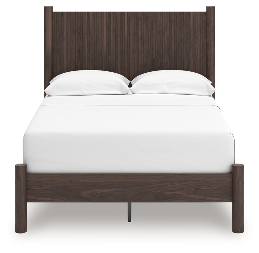 Crafted with both form and function in mind, this full panel platform bed brings a dash of retro-cool character to your modern boho aesthetic. Reeded accents add an on-trend touch to its classic silhouette. Warmly welcoming with a rich brown finish, this bed pairs well with muted hues, earth tones and other neutrals alike. What a refined take on easygoing style.
