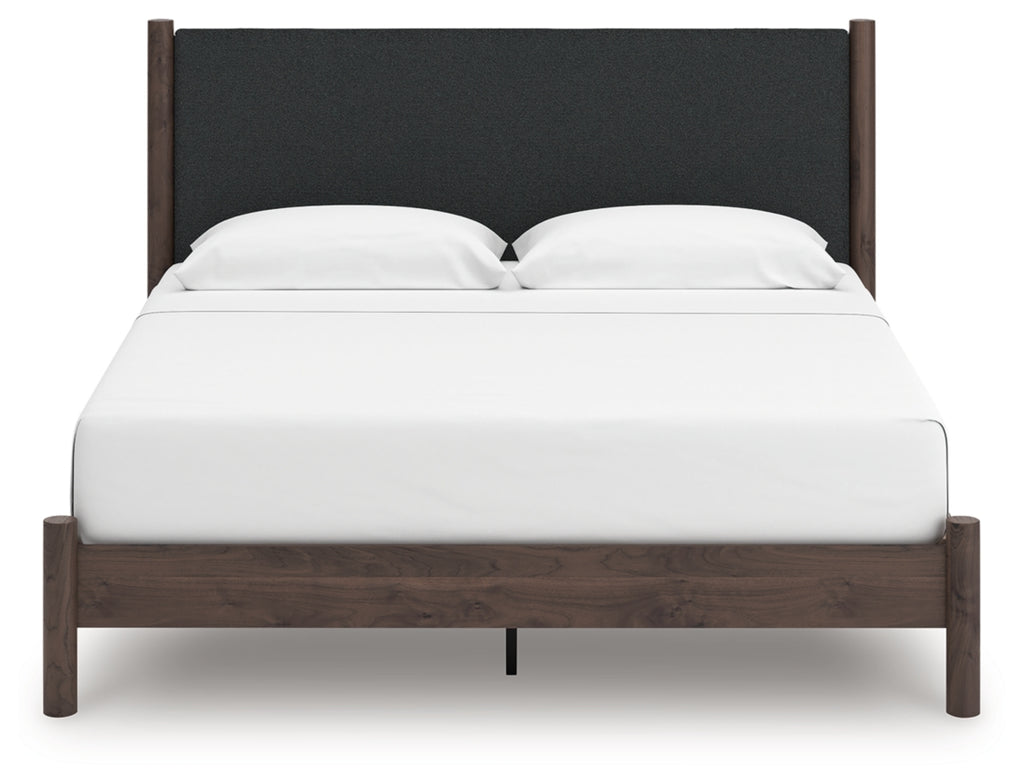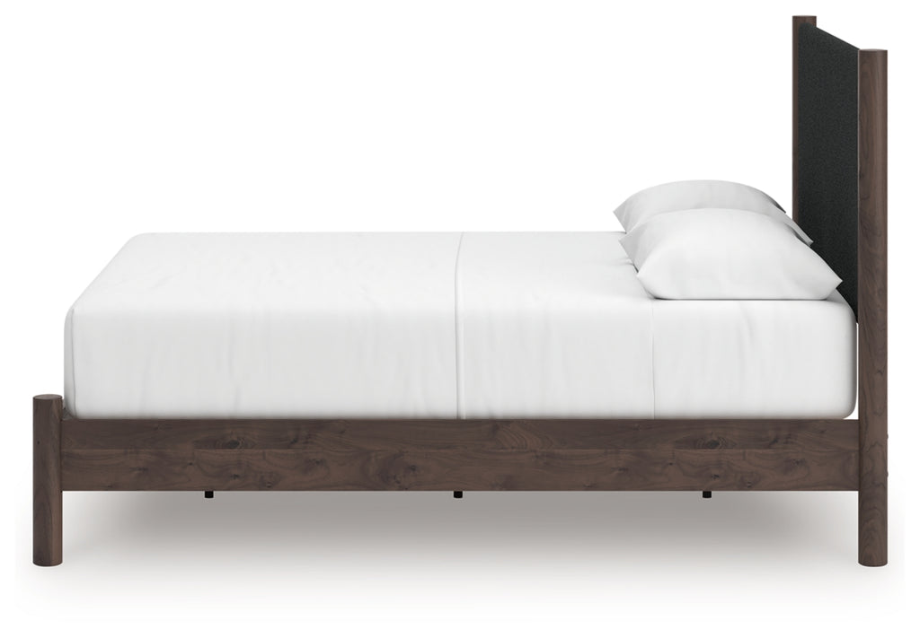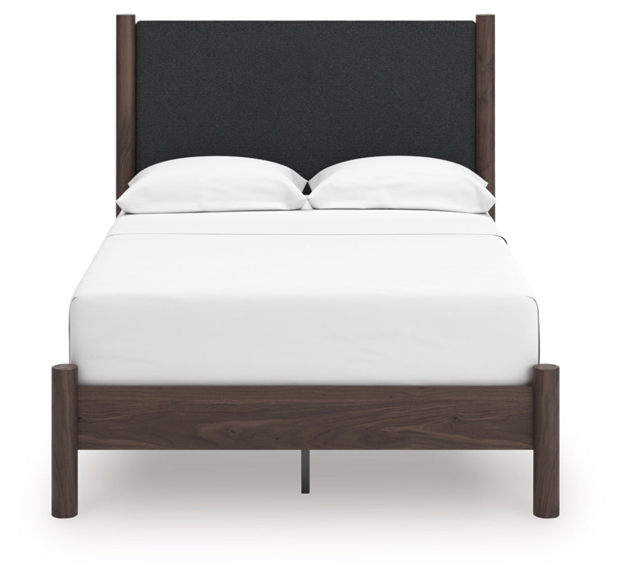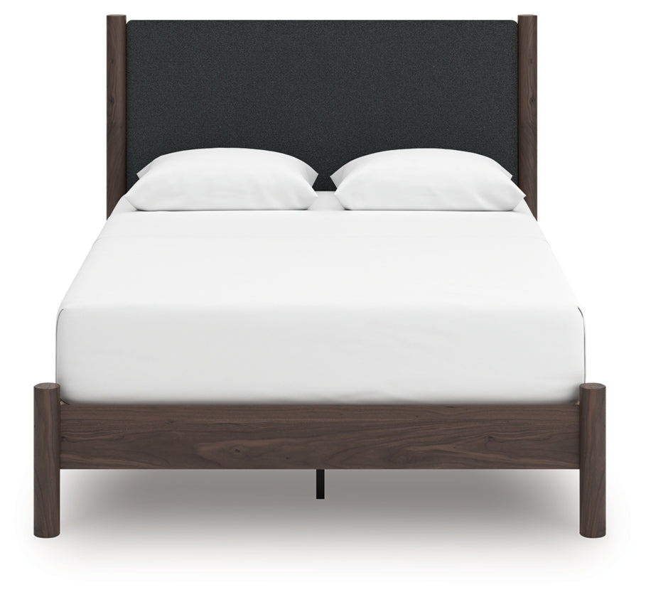 Crafted with both form and function in mind, this queen upholstered panel platform bed brings a dash of retro-cool character to your modern boho aesthetic. Its textured black headboard fabric adds a trend-right touch to the classic silhouette. Warmly welcoming with a rich brown finish, the bed pairs well with muted hues, earth tones and other neutrals alike. What a refined take on easygoing style.