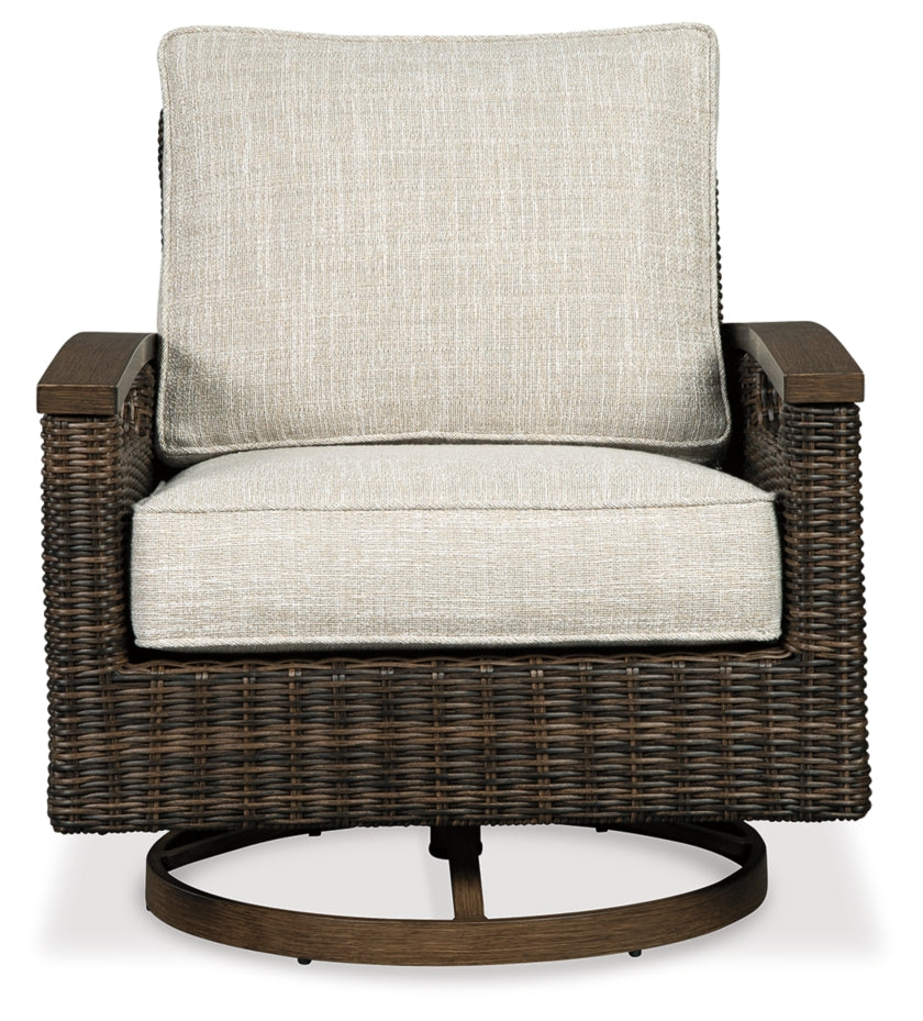 - Collection has hand woven resin wicker with rust free aluminum frames with a brown wood-look finish.