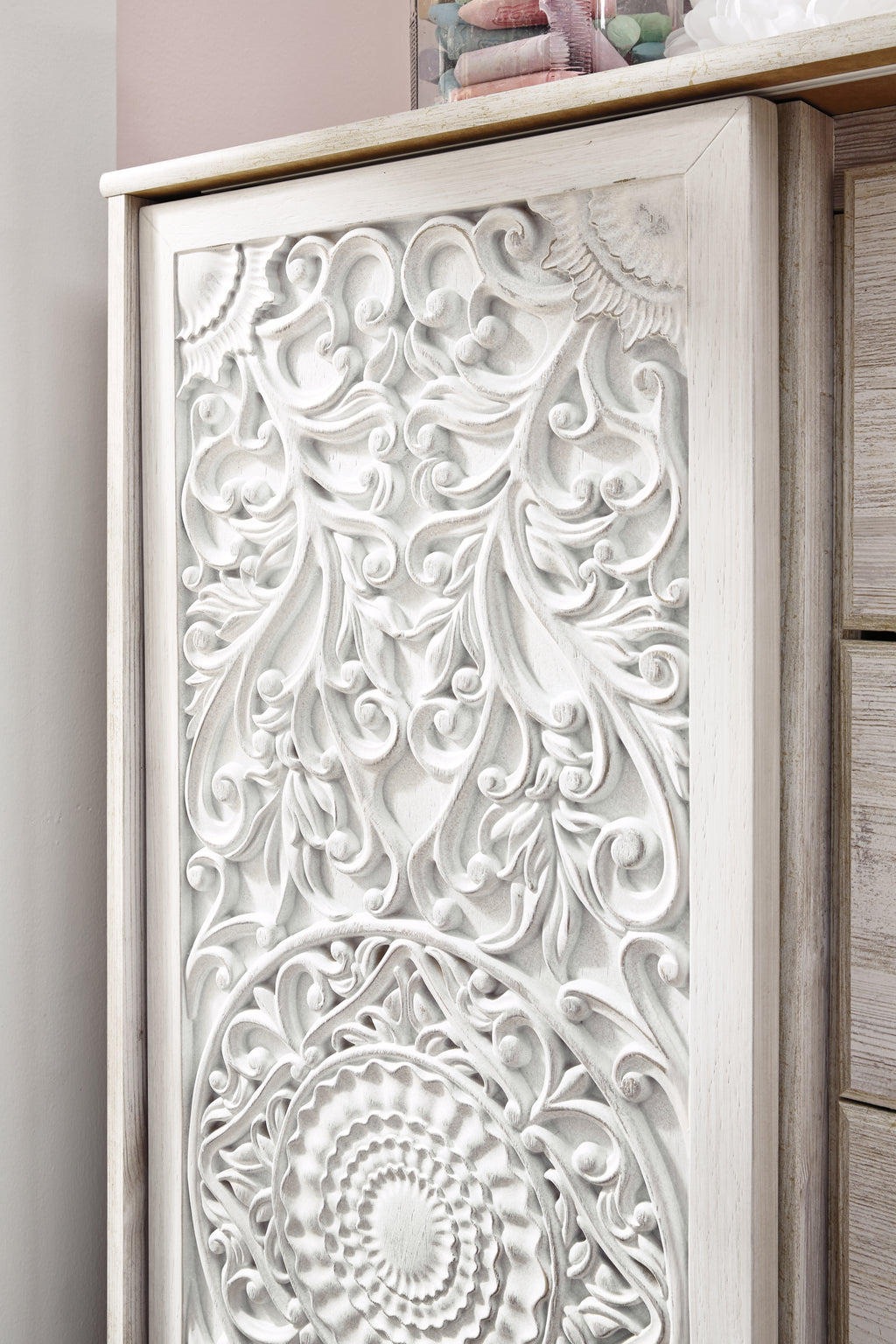 Showcase your trend-setting spirit with this bed. Inspired by bohemian tapestries, exquisite carved medallion pattern is a testament to boho-chic style. Whitewash finish sets a foundation for a room bursting with personality. Chest and nightstand included.