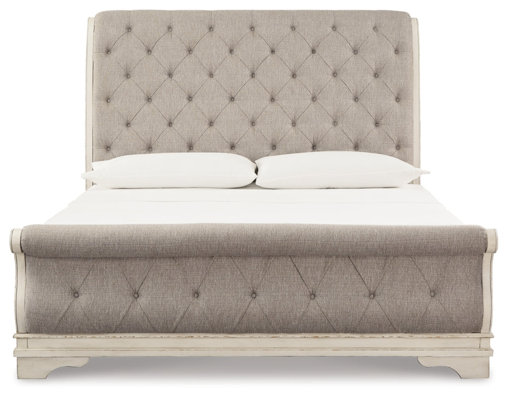Elevating the art of traditional cottage styling, this queen upholstered sleigh bedroom set is your dream bedroom retreat realized. A curvaceous beauty, this brilliant upholstered bed wows with a chipped white finish for heirloom appeal. Deep tufting on the cushioned upholstered headboard and footboard adds such a cozy element sure to put you at ease. Mattress and foundation/box spring available, sold separately.