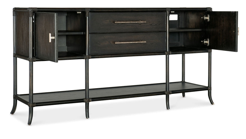 With a laid-back island vibe and mix of organic materials, the Retreat Pole Rattan Sideboard is crafted of Oak and Maple Veneers with rope accents at the joints. The light sand-colored finish is transparent by design to reveal the unique grain patterns of the wood veneer. Featuring ample storage, the sideboard has two doors with magnetic door catches with one adjustable shelf behind each door. There are two self-closing drawers, and the top drawer has a removable felt liner and removable silverware tray. The lower fixed shelf is ideal for display or storage. Soft pewter bar pull and “T” pulls on the doors add a distinct accent.