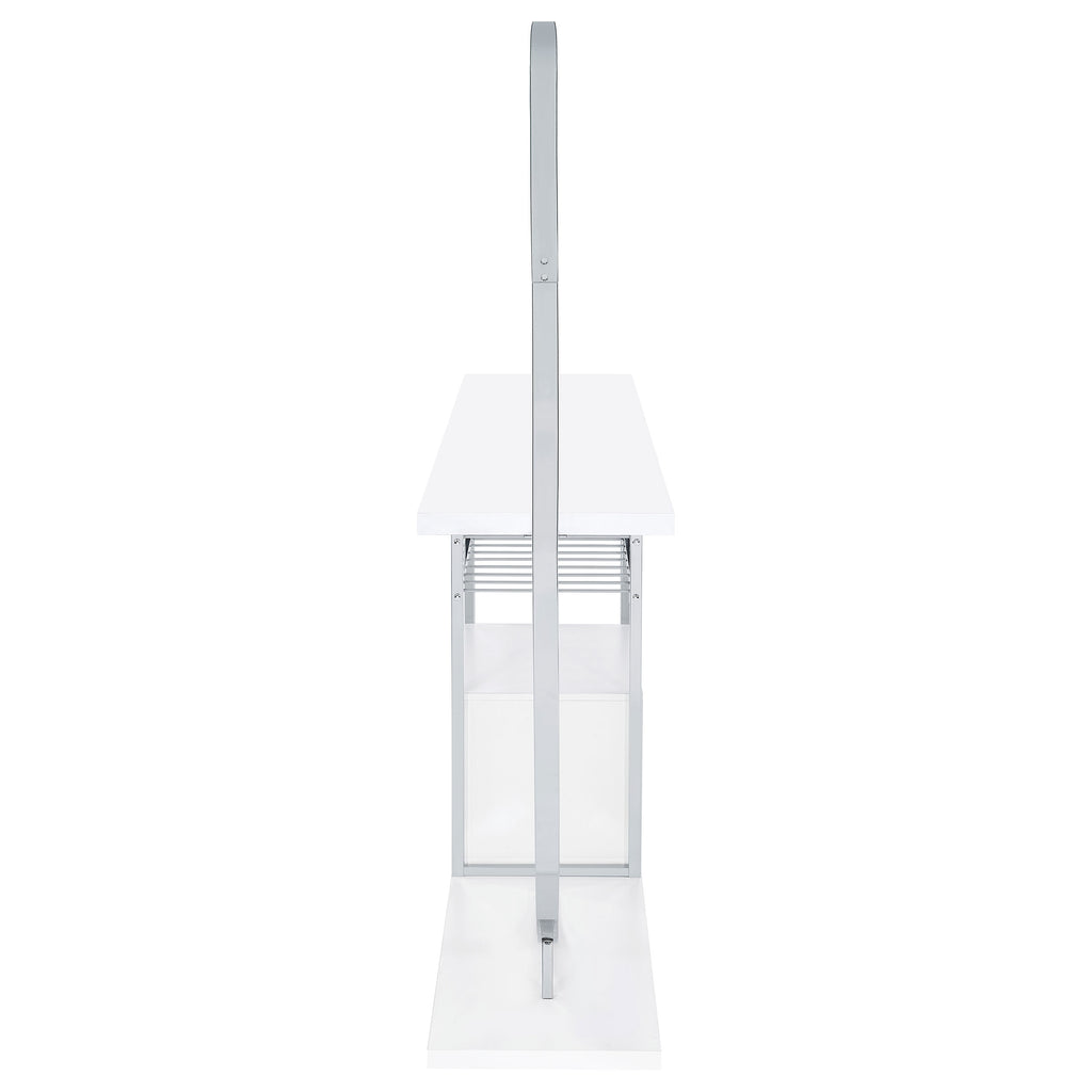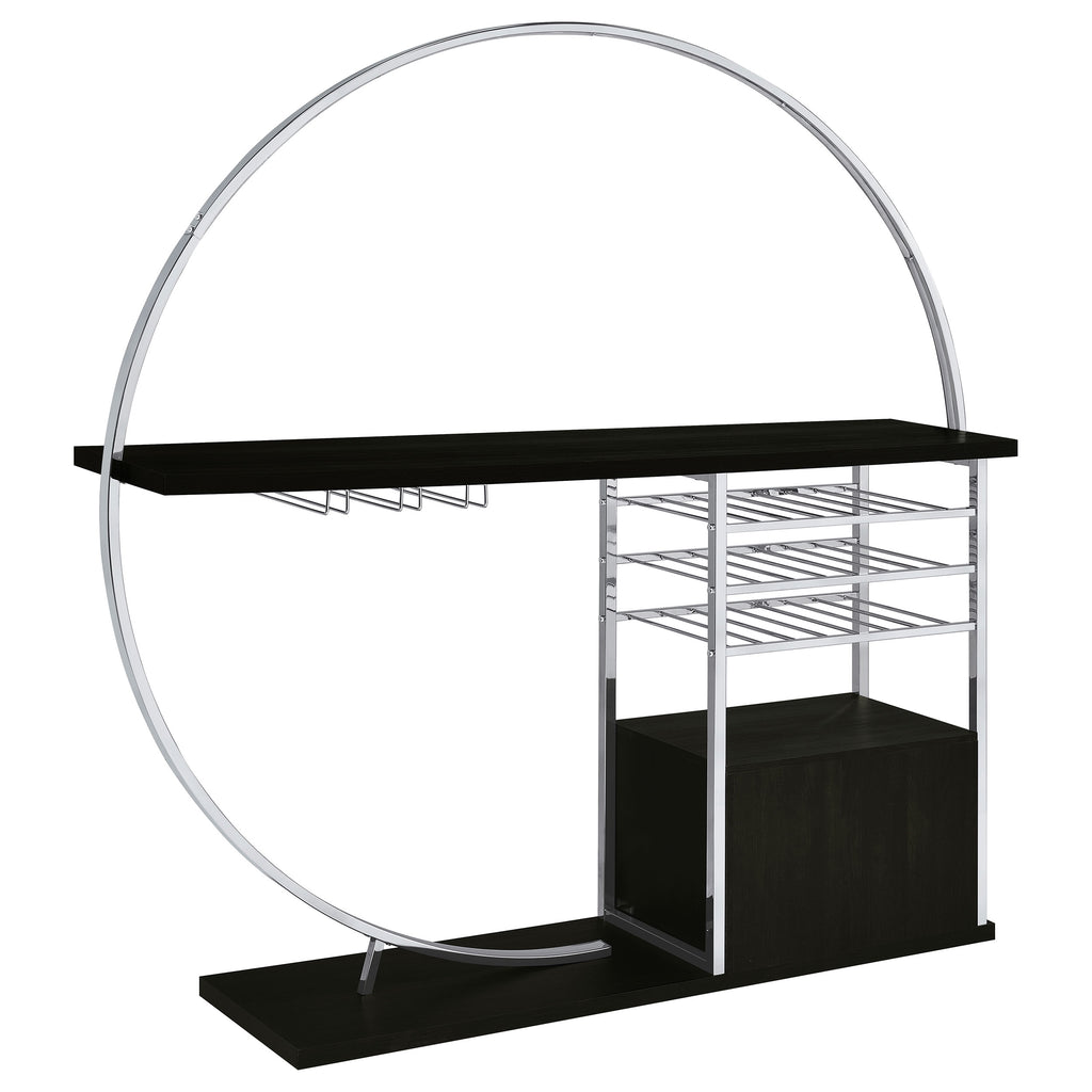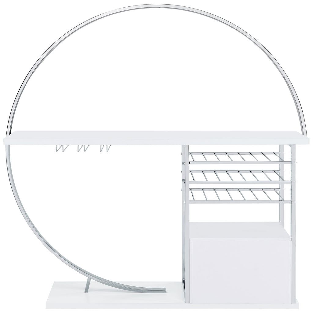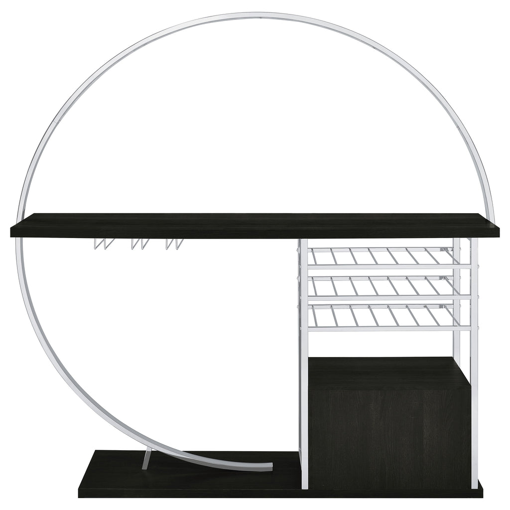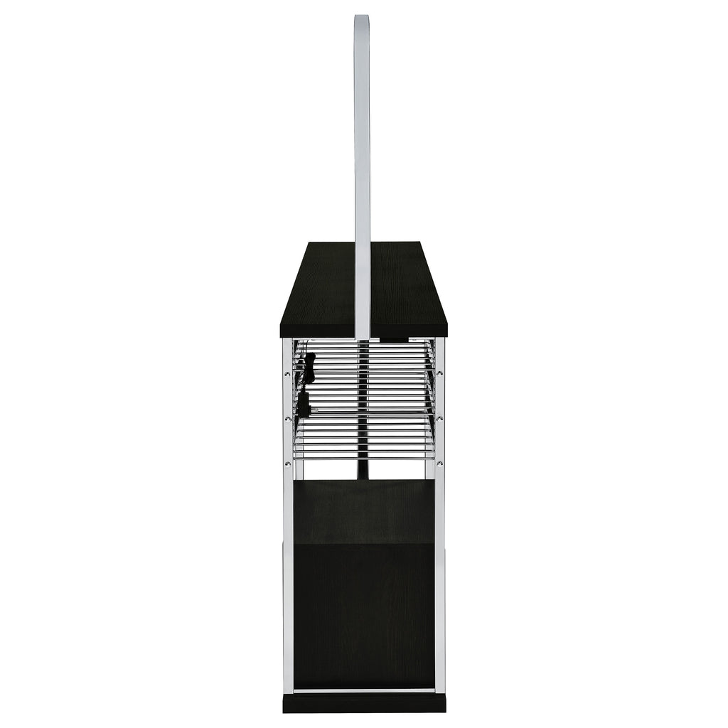 Transform your space into a beacon of style with this contemporary home bar that marries function with cutting-edge design. Bathed in the glow of LED lighting with a choice of eight vibrant colors, this piece becomes the centerpiece of any entertainer's haven. The sleek chrome electroplated metal frame supports a durable composite wood tabletop, perfect for hosting an array of glasses and spirits. Below, a two-door cabinet conceals essentials, while three tiers cradle up to 21 bottles of your finest wine. With a built-in stemware rack, this bar doesn't just store your collection, it showcases it, making every occasion a toast-worthy affair.