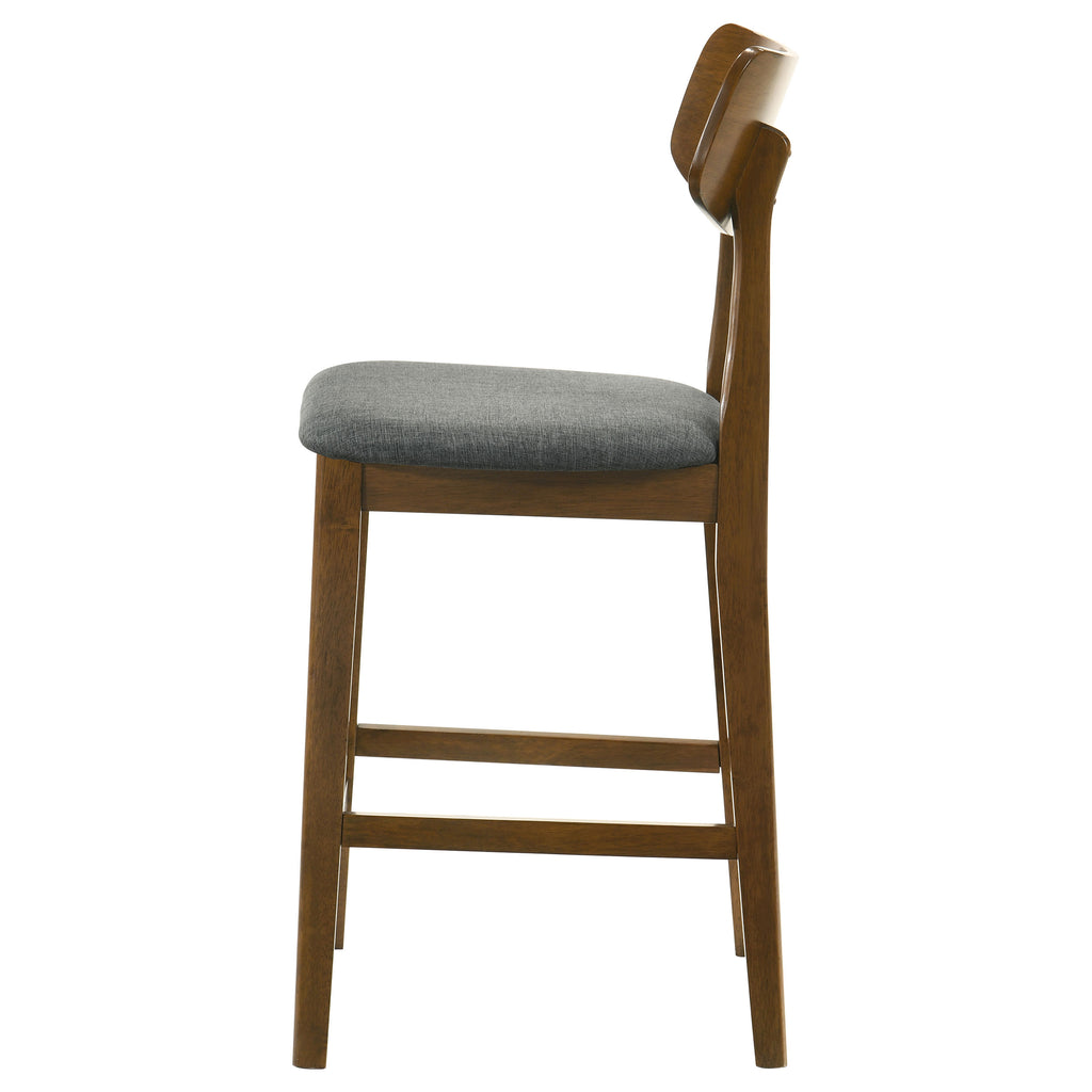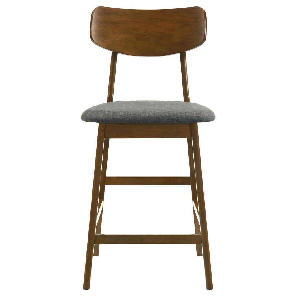 Create a warm and inviting breakfast nook with this charming five-piece modern counter height dining set. Centering on a 47-inch table, it boasts a rich walnut finish that lends timeless character and style. The table boasts angled fin-style legs that add dimension and character. Counter chairs offer plush comfort with foam-padded seats covered in inviting gray upholstery. Curved backrests and built-in footrests complete the design and offer incredible comfort, perfect for quick bites and leisurely dining.