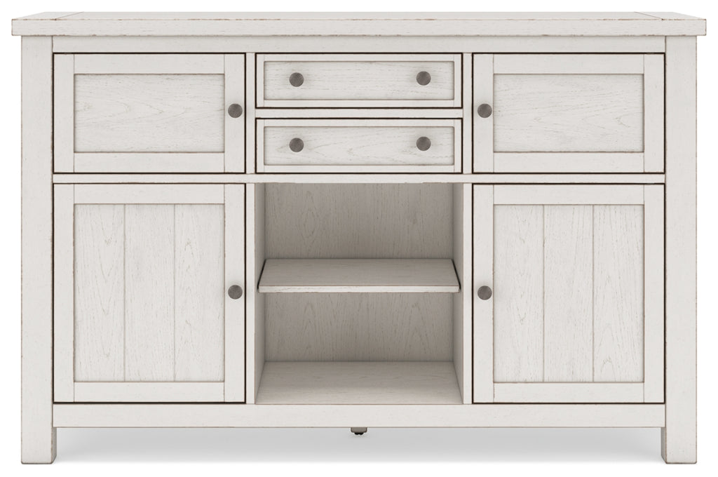This dining server is sure to impress come mealtime. With its antiqued white finish and planked effect cabinet doors, farmhouse-style storage has never been so fashionable. All that’s missing is you and your family.
