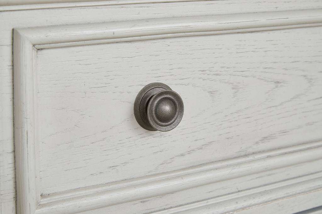 - Dovetail drawer construction with metal ball bearing side glides and dark bronze-toned knobs.
