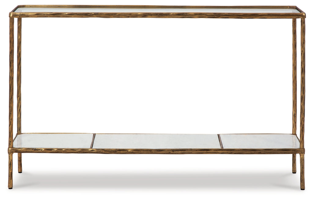 Classic in design with a dash of textural appeal, this console table provides both flair and function. Ideal to rest behind a couch or in an entryway, its glass tabletop and white marble lower shelf offer the perfect perch for decorative pieces. The frame's antiqued brass-tone finish has a rustically luxe look that remains versatile, suiting spaces from casual to contemporary.