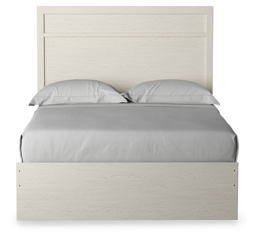 With its clean-lined look and modern attitude, this full panel bed is a fresh style awakening. A crisp, white hue over subtle replicated wood grain easily complements other furniture finishes. The simple, unadorned profile is given depth and dimension with the addition of plank-style moulding on the headboard—proof that beauty lies in the details.