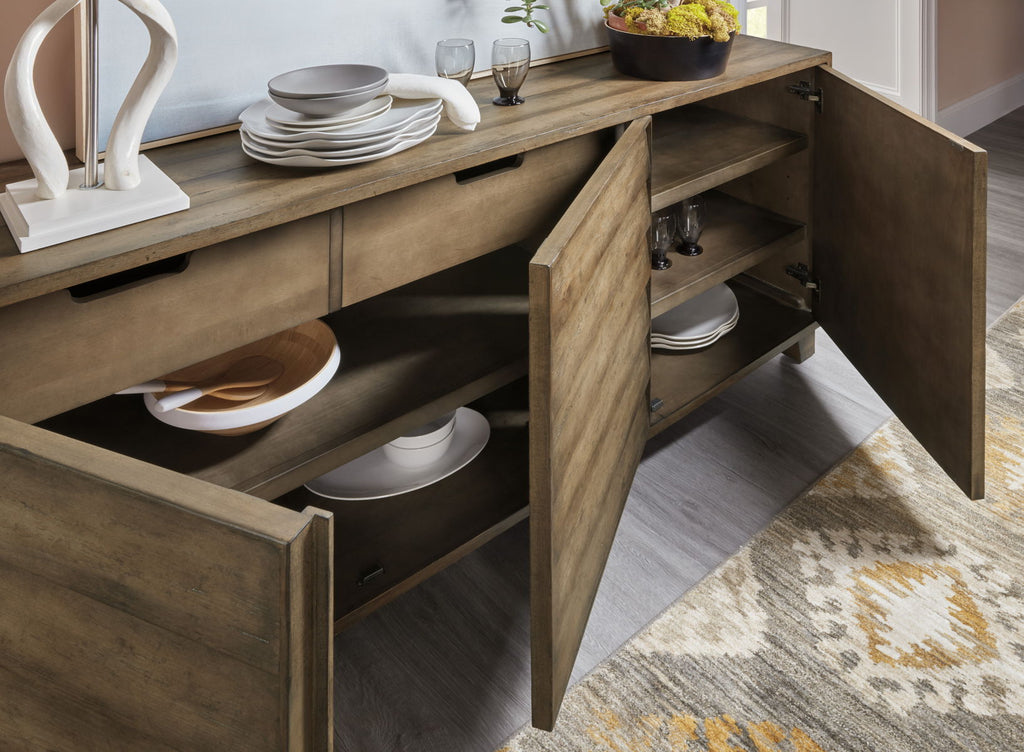 - Two self-closing drawers behind left pair of doors