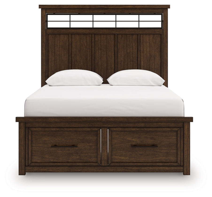 Style, simplicity and charm are hallmarks of this queen panel storage bed. Created with casual spaces in mind, it has the versatility to suit styles from craftsman to modern farmhouse. The rich brown finish aligns with your refined-meets-relaxed approach to everyday style. Short on storage space? Ultra-spacious under bed drawers keep extra clothes and linens neatly tucked away. And for a timeless touch, black metal fretwork on the headboard brings an inviting mixed-material feel to the overall look.