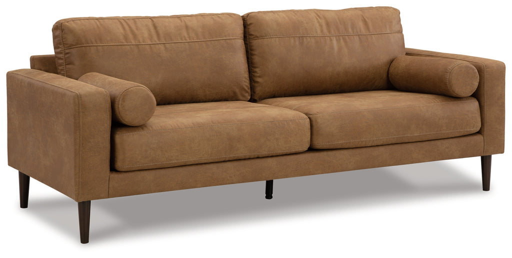 Small-scale style, tailored to perfection. This seating package echoes retro aesthetics with warm caramel faux leather, while its ultra-linear silhouettes incorporate a contemporary edge. Versatile in form and function, this set suits styles from modern boho to transitional. And its size helps you to confidently curate your compact space without sacrificing comfort (or your budget).