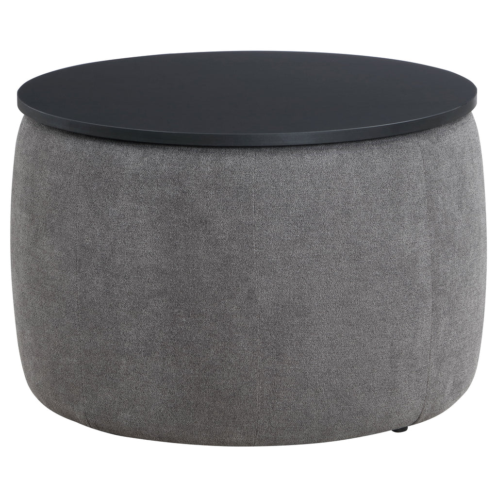 Indulge in the seamless blend of functionality and style with this chic round ottoman. Draped in sumptuously soft grey chenille, it invites relaxation while concealing a spacious storage compartment beneath its sleek black lift-top. Its subtle charm is elevated by the contrast of textures, offering an understated yet sophisticated accent to any living space. Perfect for small spaces, this ottoman combines the comfort of additional seating with the practicality of hidden storage. Envision this versatile piece as the focal point in your room, where convenience meets modern elegance.