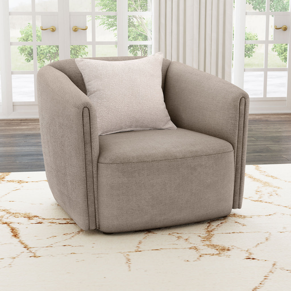 Thoughtful design highlights a modern armchair. Designed for comfort, it boasts sinuous springs and pocket coils paired with attached foam cushions for a sleek look. Its modernized shelter silhouette and sloping arms create an inviting ambiance, perfect in a living room or den. The armchair is complete with latte-colored chenille upholstery with a slight wavy pattern for a touch of texture and depth. A single accent pillow adds to a welcoming look with a feather blend fill.