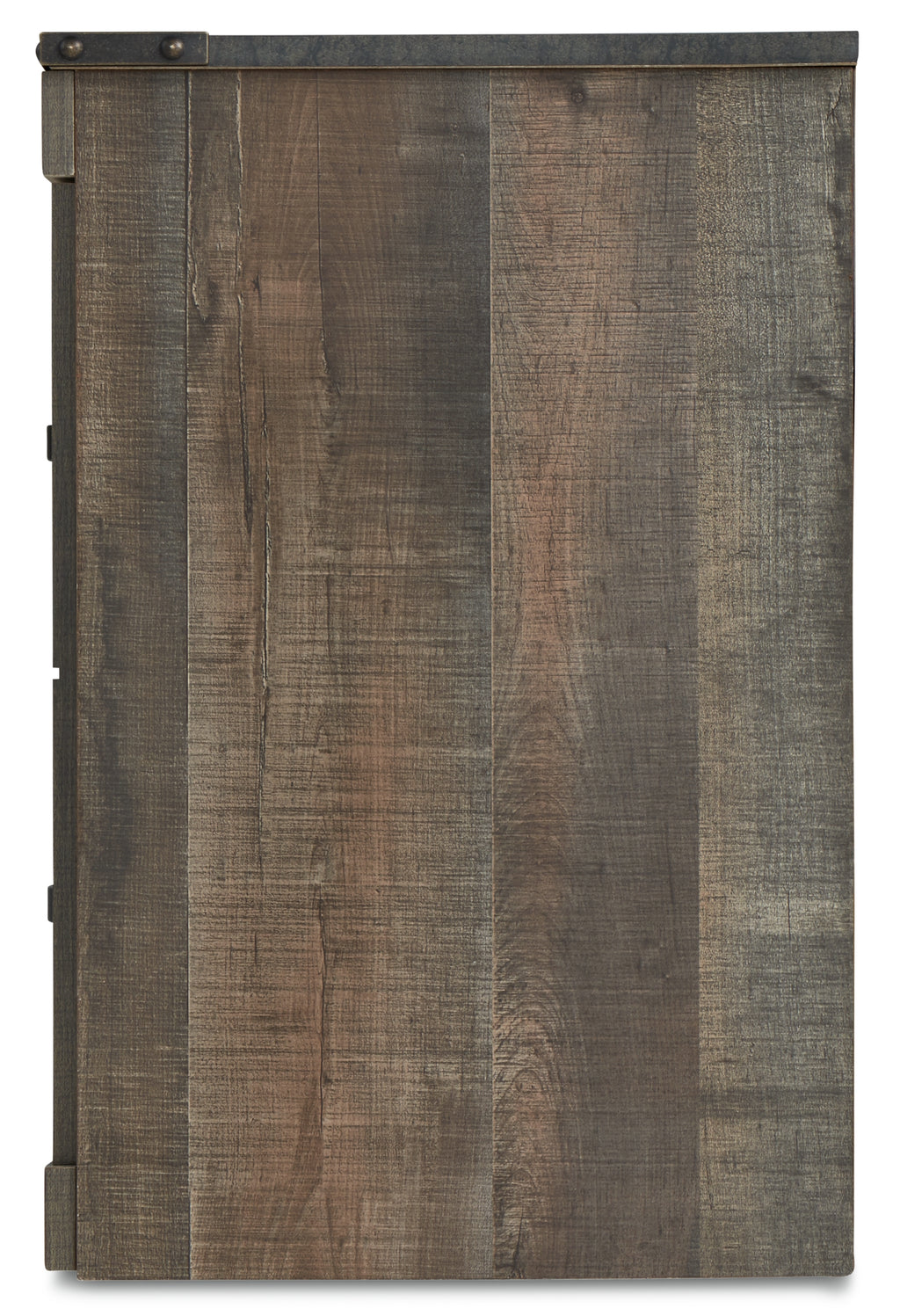 Entertain a rugged-yet-refined sense of style with this TV stand. Its rustic finish and plank-style details pay homage to reclaimed barn wood, while bronze-tone banding with nailhead accents infuses a touch of industrial cool. Ultraclean lines ensure a look that can go from the country to the city and feel equally at home. Opt for the optional fireplace insert (sold separately) for added warmth.