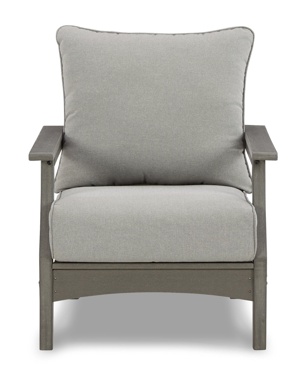 It’s the dawn of a new day for gray. Embrace the style trend with this loveseat, set of 2 chairs and coffee table set. Crafted of HDPE material that combines the exceptional durability and weather resistance you need with the "wood look" you love, this timeless set takes al fresco living to a whole new level. Slatted styling on the table naturally sheds rainwater. The thick seat and back cushions on the chairs and loveseat are wrapped in our exclusive Nuvella® high-performance fabric that’s fade resistant, stain resistant and a breeze to clean.