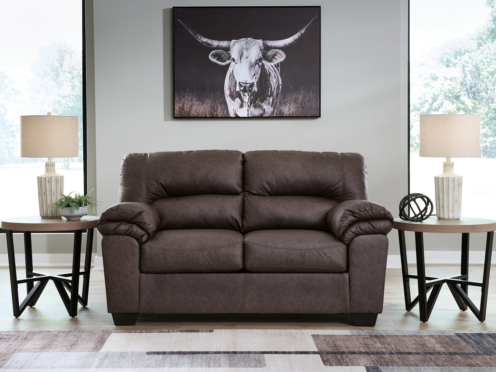 Modern comfort never looked so good. Sporting supremely soft yet durable cushions accented with high-fashion jumbo stitching, this stunning loveseat is the ultimate choice in comfortably cool, contemporary style. Its umber-hued faux leather indulges with an upscale feel and wows like the real thing.