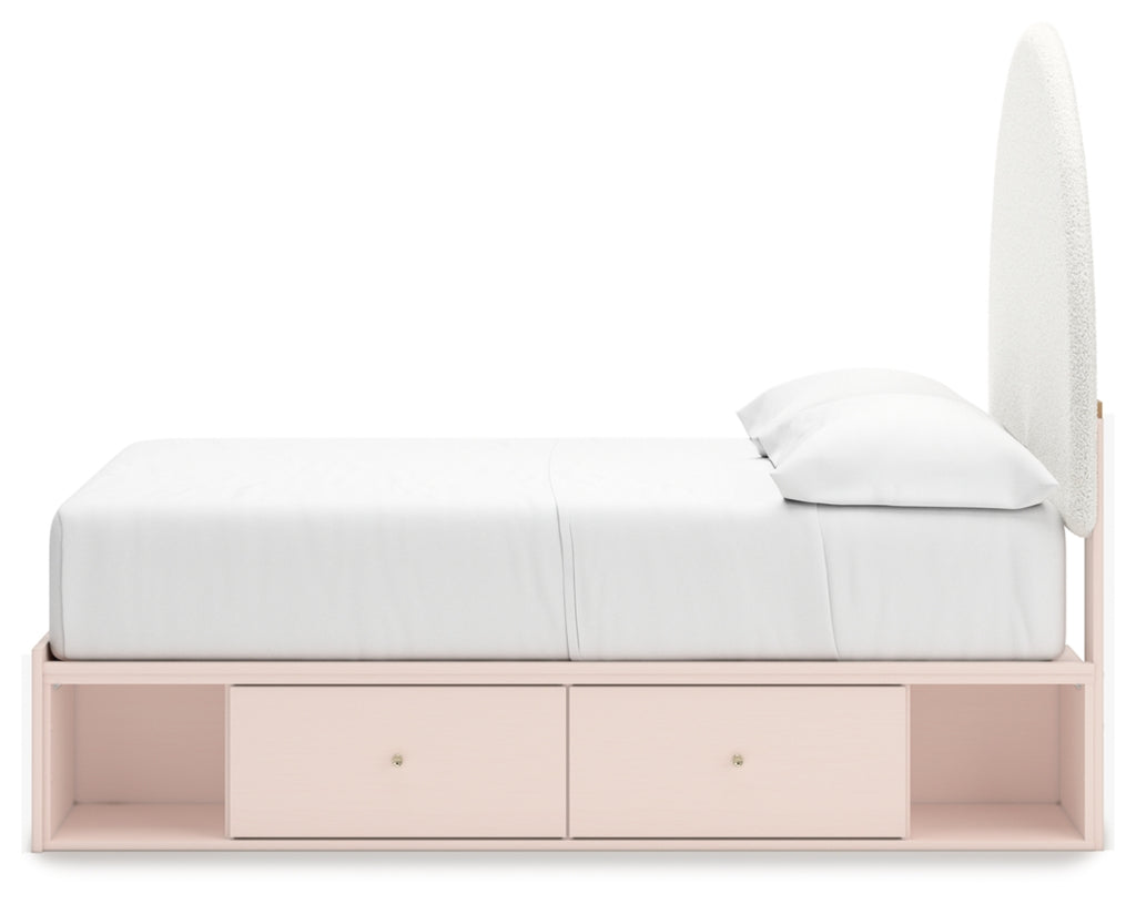 Pretty in pink. This full upholstered panel bed with storage keeps the spirit of your home’s modern aesthetic while suiting all your young one’s needs. Its cozy-cute upholstery and subtle blush finish bring a playful, charming vibe to bedtime. Made for her and styled for you, it’s a lovely addition to a beautifully chic child’s bedroom.