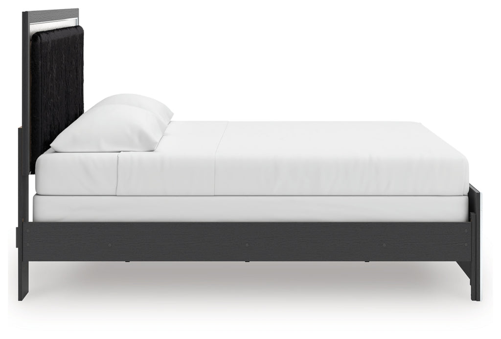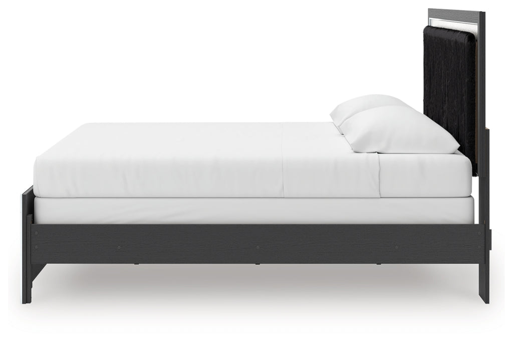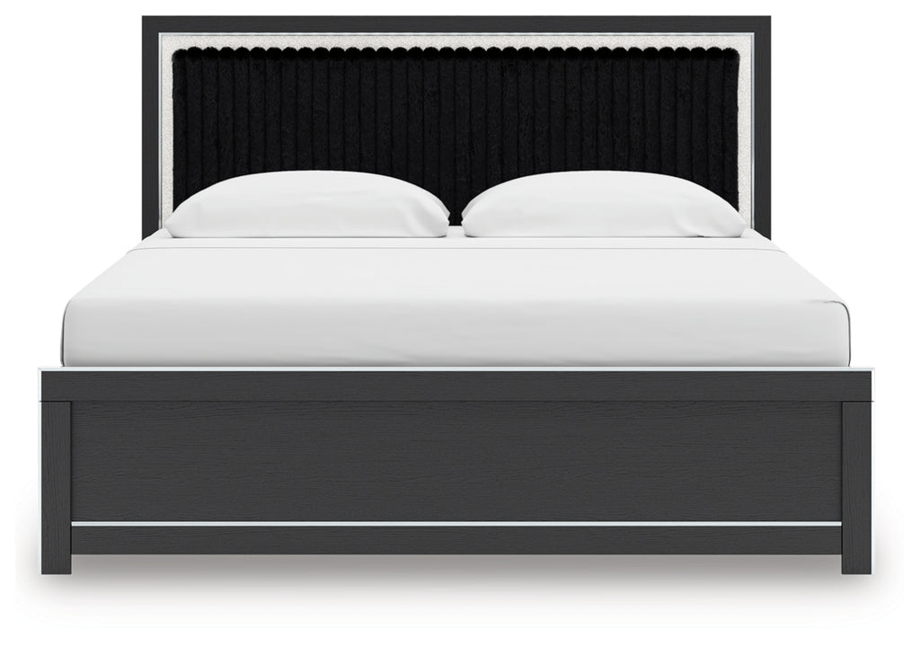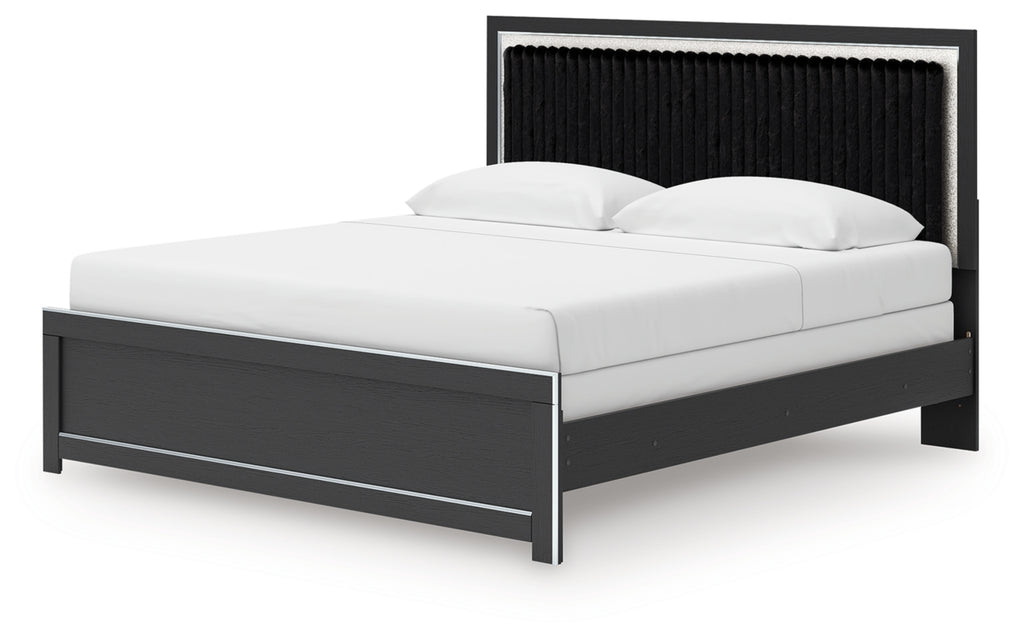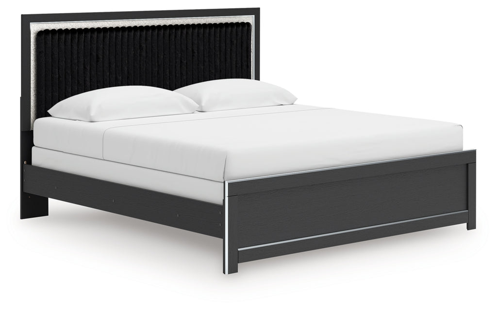 - Headboards are accented with faux fur tufted black upholstery and glitter details.