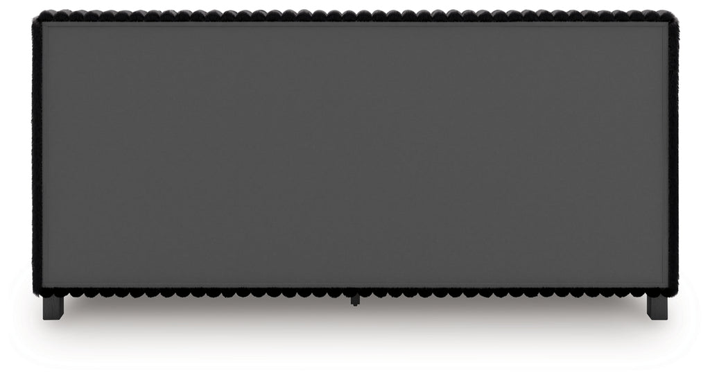 - Headboards are accented with faux fur tufted black upholstery and glitter details.