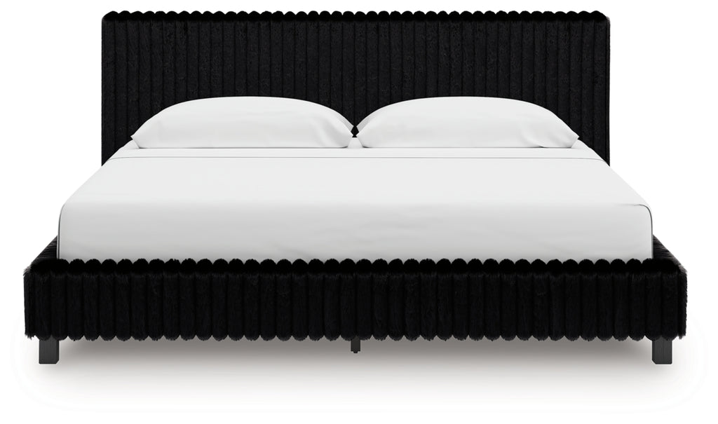 - Headboards are accented with faux fur tufted black upholstery and glitter details.