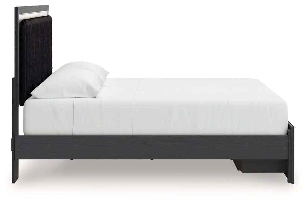 - Includes upholstered panel headboard, storage footboard, platform rails and roll slats