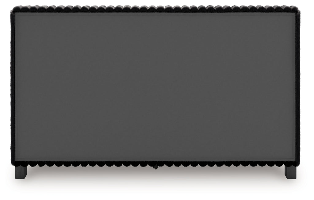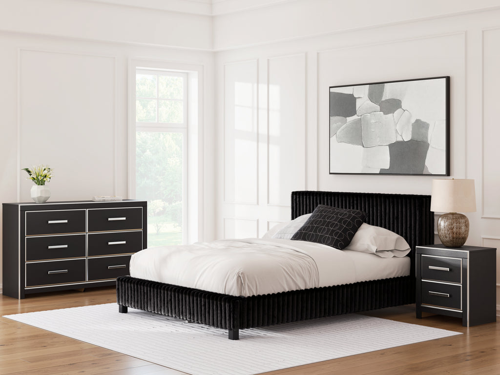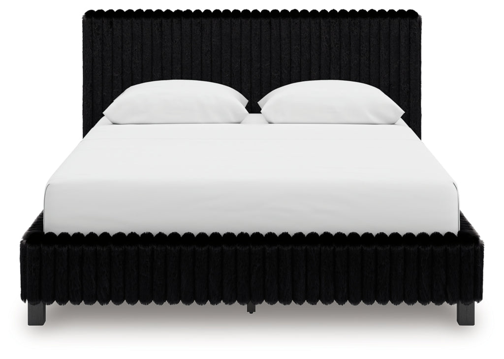 - Headboards are accented with faux fur tufted black upholstery and glitter details.