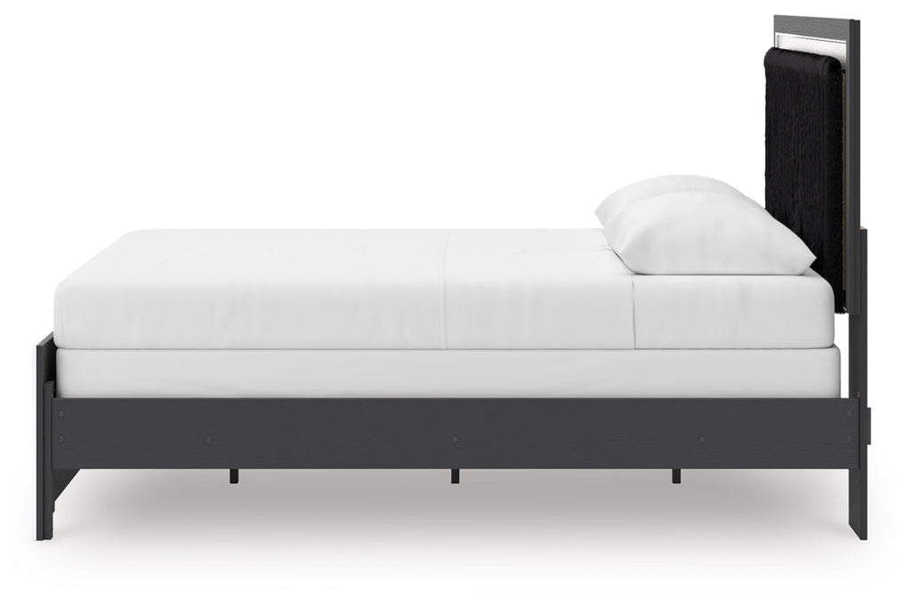 - Includes upholstered panel headboard, panel footboard and panel rails