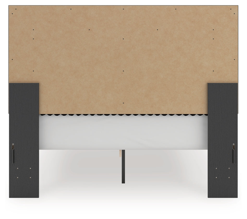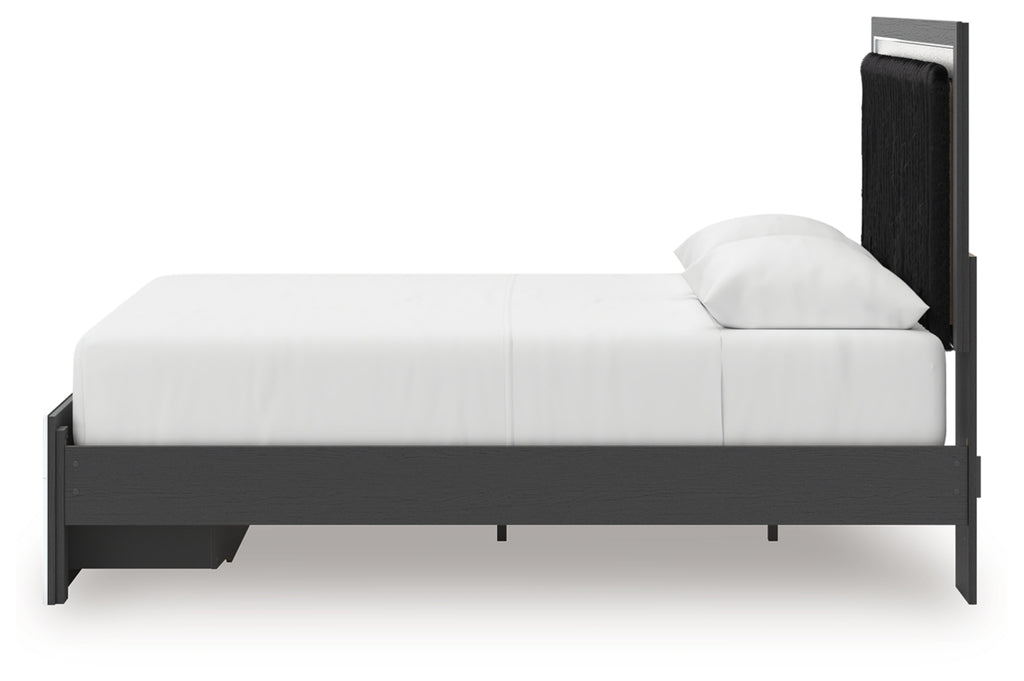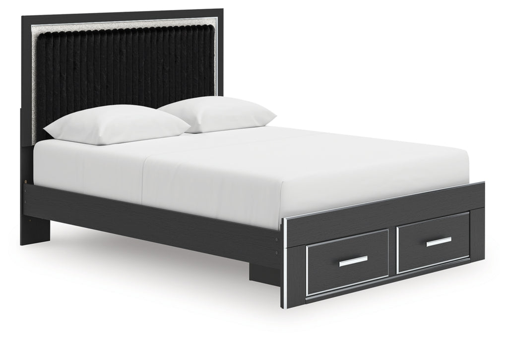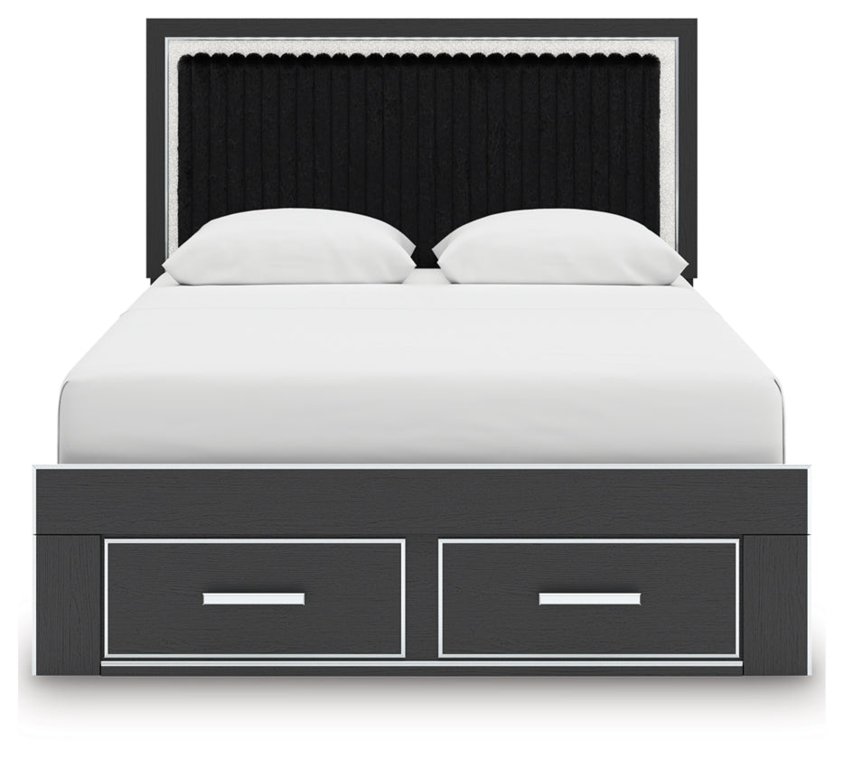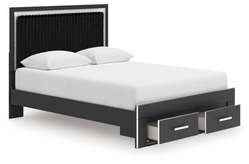- Includes upholstered panel headboard, storage footboard, roll slats and platform rails